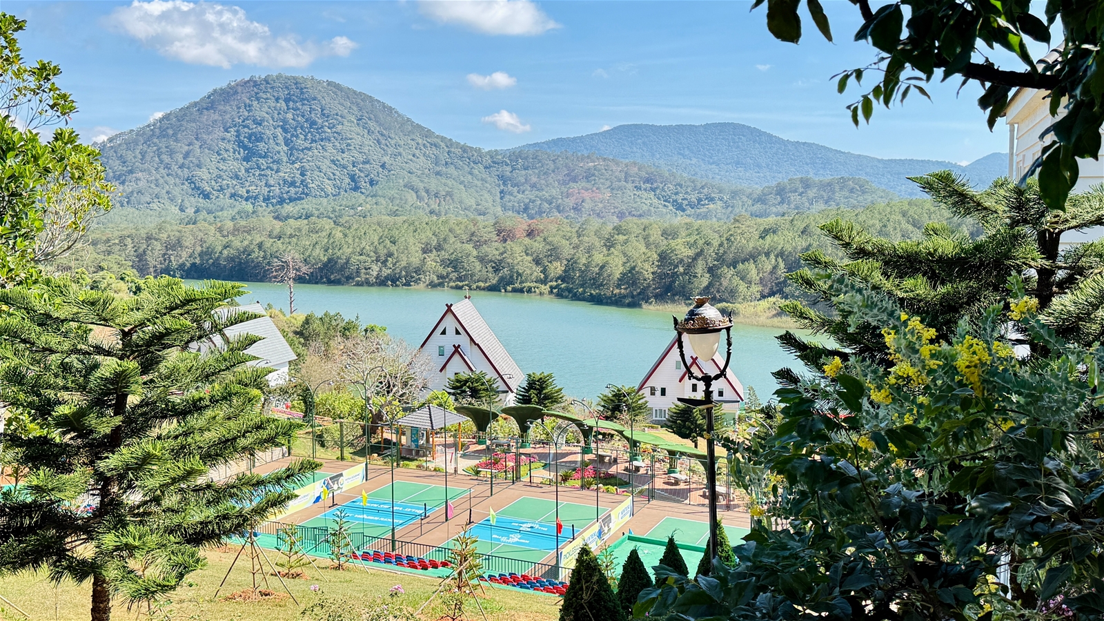 Từ trên cao nhìn xuống, toàn cảnh resort mở ra như một bức tranh thiên nhiên hài hòa, với hồ nước phẳng lặng, không khí mát lành và ánh nắng nhẹ nhàng phủ lên từng mái nhà. Không gian nơi đây mang đến cảm giác thư thái, giúp du khách tạm rời xa nhịp sống bận rộn và tận hưởng trọn vẹn kỳ nghỉ đầu năm tại Đà Lạt.