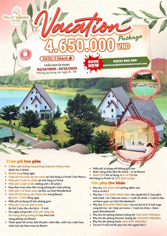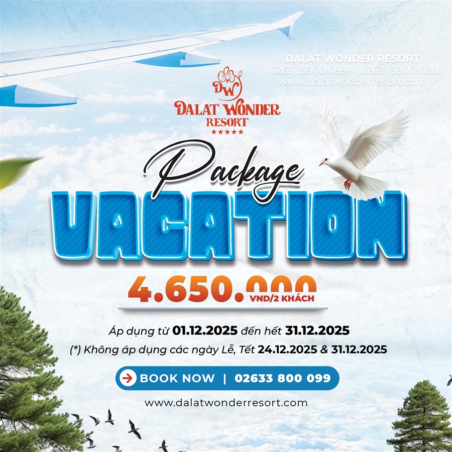 Đừng để những ngày cuối năm trôi qua một cách vội vã. Hãy dành 3 ngày 2 đêm tại Dalat Wonder Resort – nơi mệnh danh là “Làng Châu Âu” bên hồ Tuyền Lâm, để đắm mình trong không gian thơ mộng, chất lượng dịch vụ chuẩn 5 sao, với mức chi phí tối ưu không tưởng!