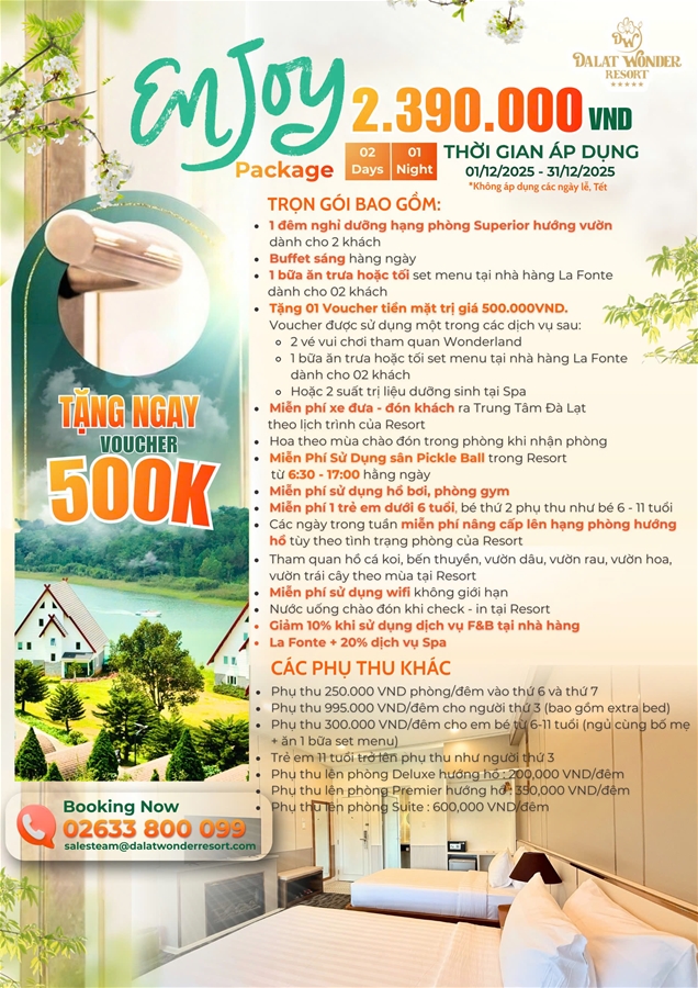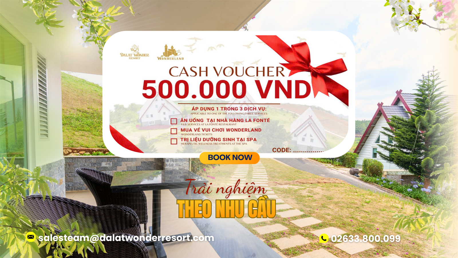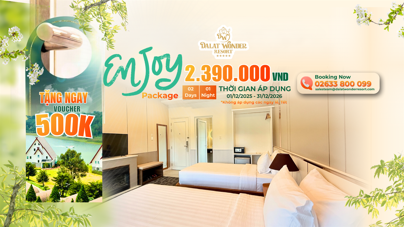 Gói ENJOY PACKAGE còn tặng kèm Voucher 500.000đ cho phép bạn tự chọn: Spa, Ẩm thực cao cấp, hoặc Vui chơi Dalat Wonderland. Cá nhân hóa chuyến đi theo mong muốn cảm xúc của riêng bạn.