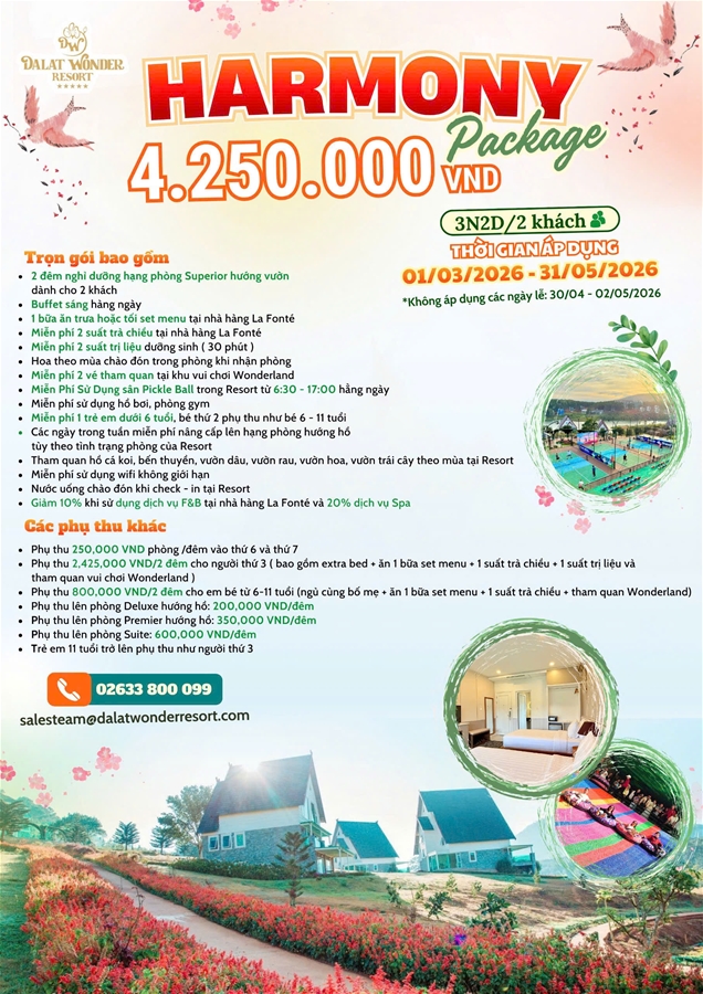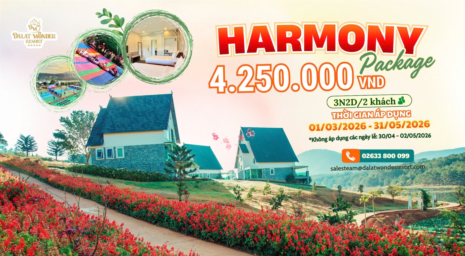Harmony Package tại Dalat Wonder Resort được thiết kế như một bản hòa ca của nghỉ dưỡng, chăm sóc sức khỏe và trải nghiệm – nơi mỗi khoảnh khắc đều mang đến sự thư thái và tái tạo năng lượng.